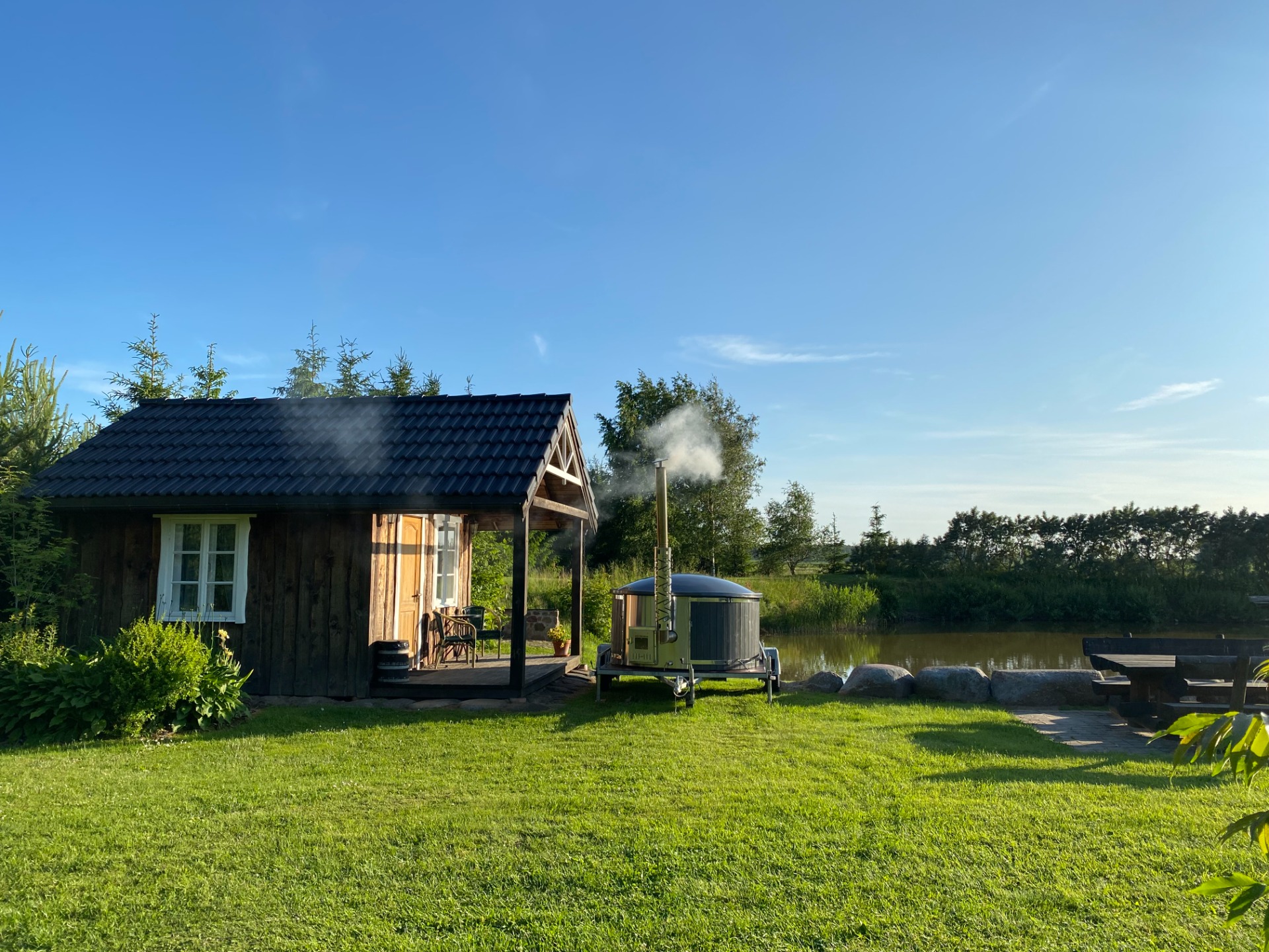 Pieejams grils, ugunskura vieta, kubls, savvaļas vannas, tipi sauna.